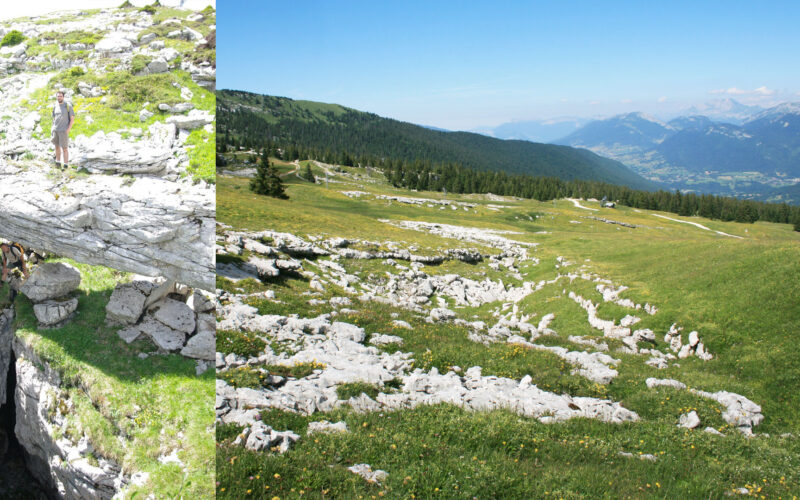 En parcourant le sentier des Tannes et glacières, vous cheminez sur une dalle de calcaire urgonien déposée il y a près de 120 millions d’années. Aujourd’hui inclinée vers la vallée des Aillons, cette épaisse couche de calcaire récifal a enregistré différents événements qui jalonnent l’histoire géologique du massif des Bauges. Son inclinaison est acquise lors de la formation des Alpes il y a environ 20 millions d’années. Ses morphologies karstiques typiques sont l’œuvre de phénomènes de dissolution qui ont affecté le massif, depuis son émersion, sous différents climats, notamment glaciaires.